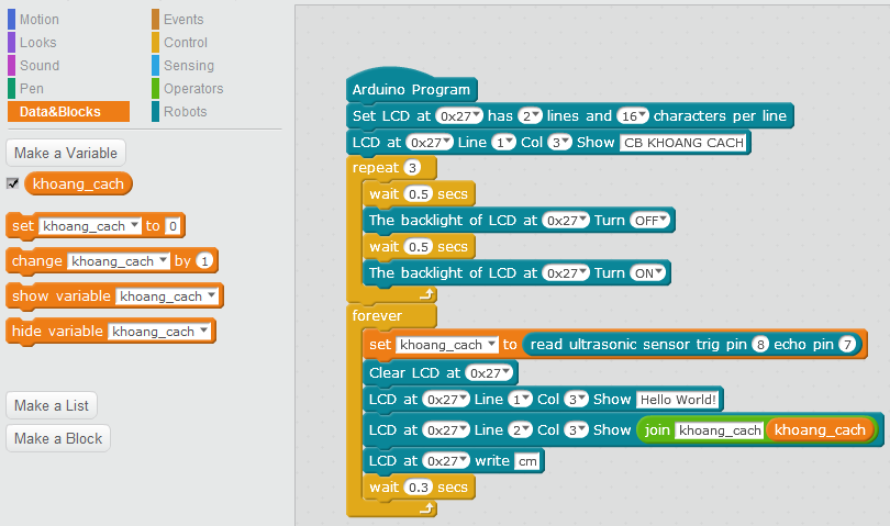 Bài 10: Lập trình mBlock với CB khoảng cách SFR05 hiển thị lên màn hình LCD.