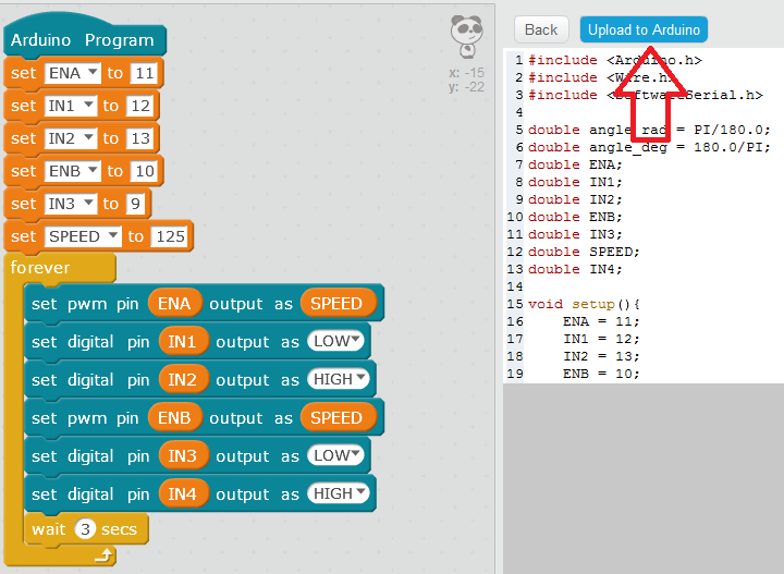 Ta chuyển qua chế độ Upload to arduino ( Edit à Arduino mode) để nạp chương trình cho arduino ( lưu ý trước khi nạp các bạn chọn đúng cổng COM và đúng board Arduino.