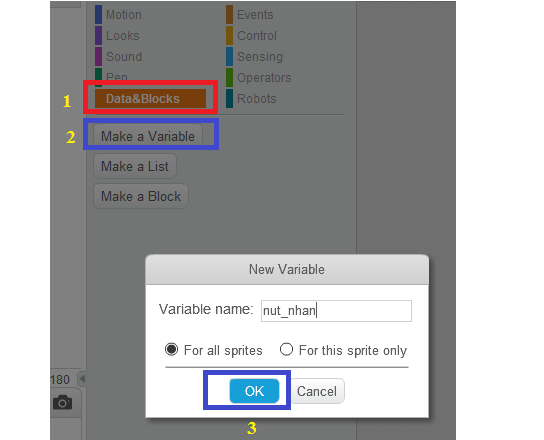 Bước 1: Tạo một biến mới tên “nut_nhan”